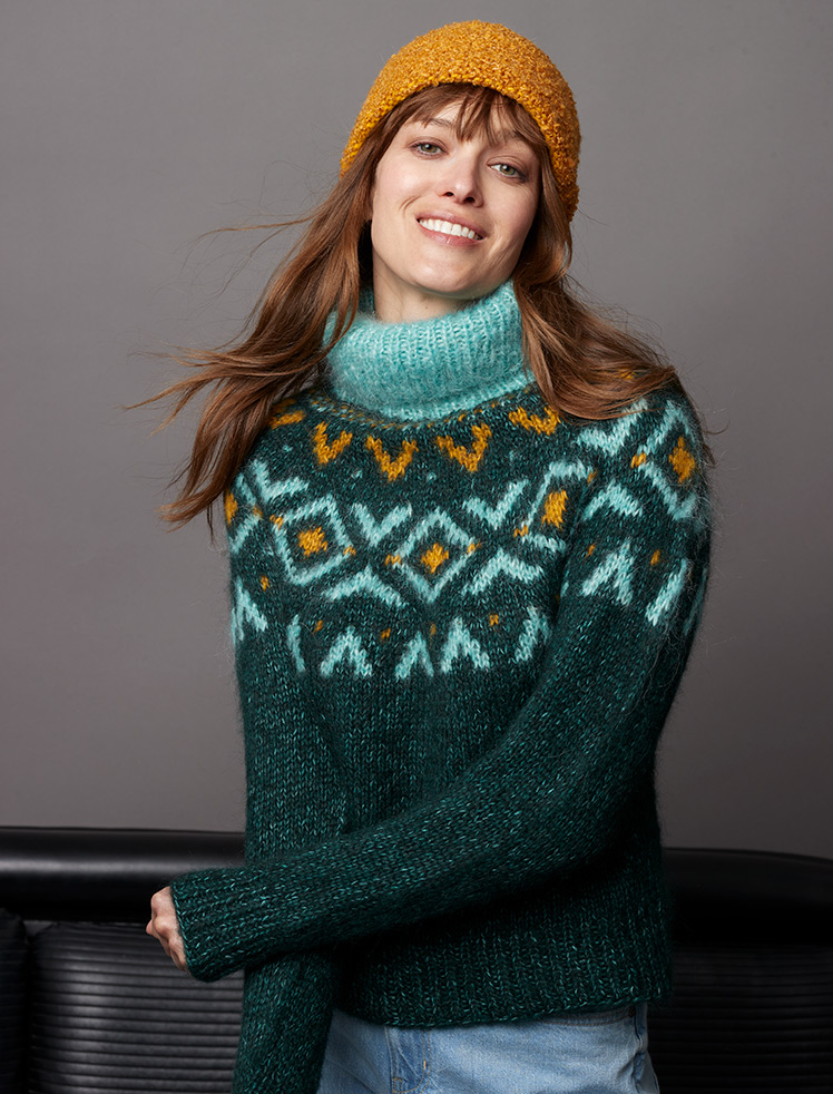 Beskrivelse Genseren strikkes ovenfra og ned på 5.5 & 6 Størrelser: 34-36/38-40/42-44/46-48/50-52 Garn: Neptune består av 43 % bomull, 40 % alpakka & 17 % mohair - 110 meter/50 g Farge 76: 5 / 6 / 6 / 7 / 8 nøster Farge 71: 2 / 2 / 2 / 2 / 2 nøster Farge 44: 1 / 1 / 1 / 1 / 1 nøste Rundpinne: 5,5 - 6 mm |