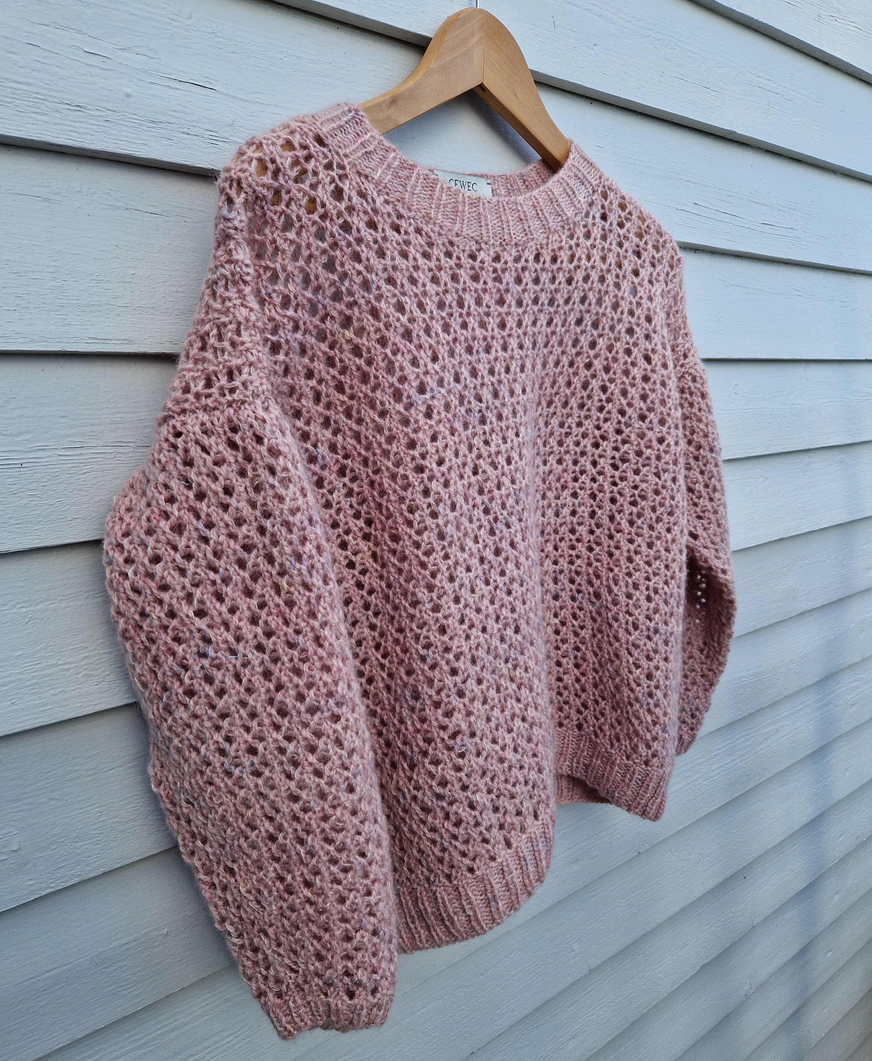 Håndstrikket, hullmønstret genser av ull, mohair og silke i str M