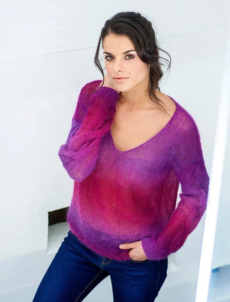 Beskrivelse Oppskriften sendes som .pdf-fil per e-post. Strikkes av 1 tråd tynn mohair eller tynn alpakka/silke. Strikket av Algashine (71 % alpakka, 15 % silke, 7 % polyester, 7 % metallpolyester) Str 34-52 |