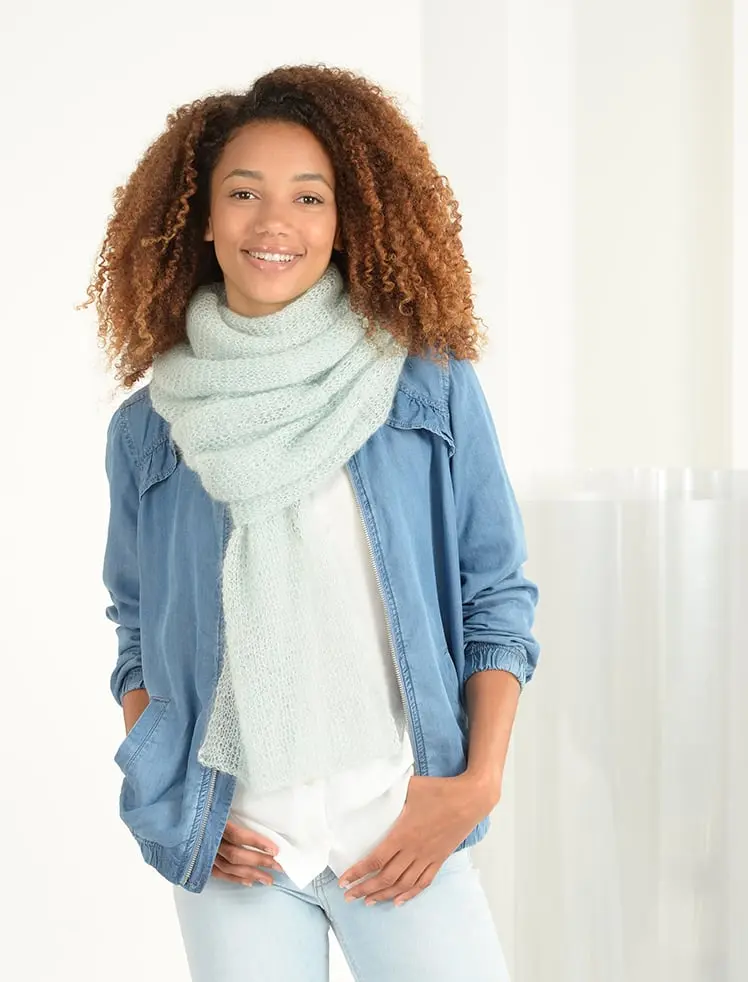 Enkelt skjerf av Algasoie (Alpakka/silke) som strikkes på p 5.