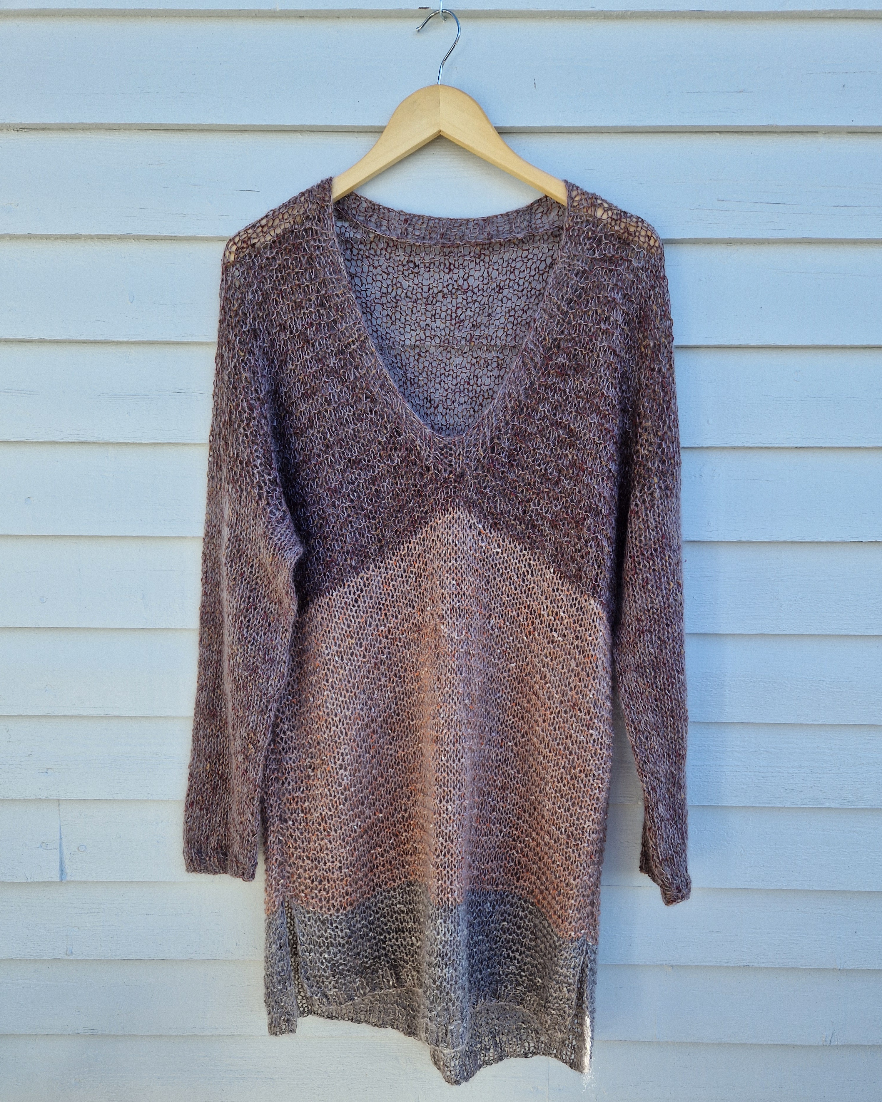 Håndstrikket genser/tunika med V-hals og splitt i sidene av 1 tråd silketweed og 1 tråd mohair/silke