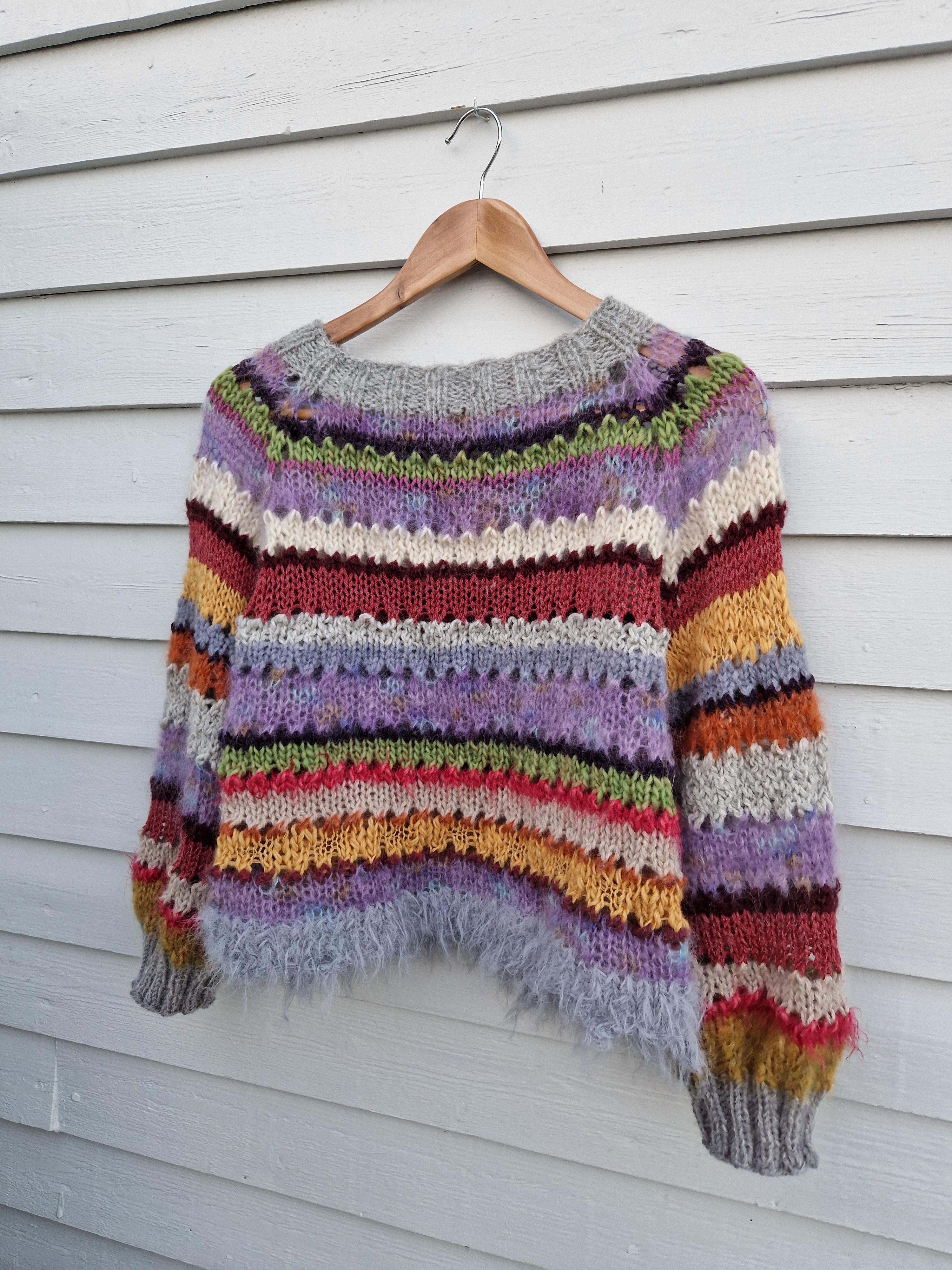Beskrivelse Håndstrikket genser av diverse garn som alpakka, ull, mohair, silke m/m. Raglan med hulleffekt. Ca str S/M Overvidde ca 105 cm Lengde: Ca 54 cm, målt fra skulderen Ermelengde målt under ca 38 cm. |